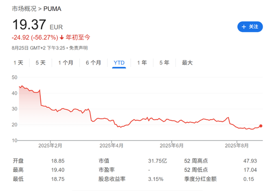 皮诺家族考虑调整其持股策略的直接原因,是彪马在资本市场的艰难处境。受运动和健身装备需求疲软,以及对美国关税影响的担忧,彪马的股价在过去12个月内已重挫50%。截至目前,该公司市值约为26亿欧元(约合30亿美元)。公司上月发布了盈利预警,进一步加剧了投资者的忧虑。